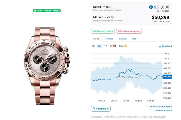 根据高级手表市场调查研究机构WatchCharts的资料,现行版Daytona系列各种材质在2025年4月时二级市场的价格早已经开始由高点往下走,钢壳白面126500LN-0001那时的行情为30,904美金(约合台币94万2)、钢壳黑面126500LN-0002为26,589美金(约合台币81万)、半金时标镶钻款126503-0002为23,544美金(约合台币71万7)、永恒玫瑰金款、黄金款、铂金款型号126505、126518LN、126506的身价依序是49,805美金(约合台币151万8)、43,436美金(约合台币132万4)和107,210美金(约合台币326万8),除了永恒玫瑰金之外,金额大多数在定价以上,系列的高人气由此可见一斑。