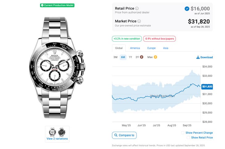 到了2025年9月底,当现行版Daytona进入二级市场的款式与数量愈来愈多,加上热门表行情下修的趋势似乎已到谷地反弹的地步,因此前述的六种型号身价起起伏伏后,比起半年前大多有所成长。同样由WatchCharts的资料可见,目前Daytona各款最新报价分别是钢壳白面126500LN-0001:31,820美金(约合台币97万)、钢壳黑面126500LN-0002:27,486美金(约合台币83万7)、半金时标镶钻款126503-0002:24,389美金(约合台币74万3)、永恒玫瑰金款126505:50,299美金(约合台币153万3)、黄金款126518LN:44,846美金(约合台币136万7),以及铂金款126506:113,812美金(约合台币347万)。之前受到美国对等关税政策、通膨疑虑等因素影响,以及黄金价格持续高升的情况下,导致贵金属表壳和半金表壳的Daytona今年以来二级市场行情纷纷走高,但是到了8月后,变成铂金、半金和两款钢壳小有成长,尤其铂金款一个月前后的成长幅度吧较明显,反而K金款式陷入不进反退的局面。