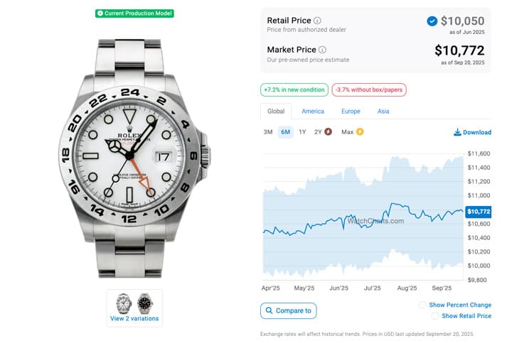 由此可知在2022~2025年定价连涨了四次之后,手表已经回不去2字头的数字,那麼这款表在二级市场上的表现又是如何?根据高级手表市场调查研究机构WatchCharts的资料,白面与黑面的探二从2022年第2季以来行情持续缓缓走跌,到2025年时似乎已经有点开始要从谷底奋起的跡象,白面探二在2025年3月的行情为10,478美金(约合台币31万7)的水准,黑面探二的身价又还略低一些,大概是9,801美金(约合台币29万6),这时手表的身价离2022年第1季的历史巔峰(约15,000美金)已经有一段距离,而且从那之后价格就开始从11,000美金区间稳步往10,000美金的水平线下调,黑面甚至已经跌破万元美金。