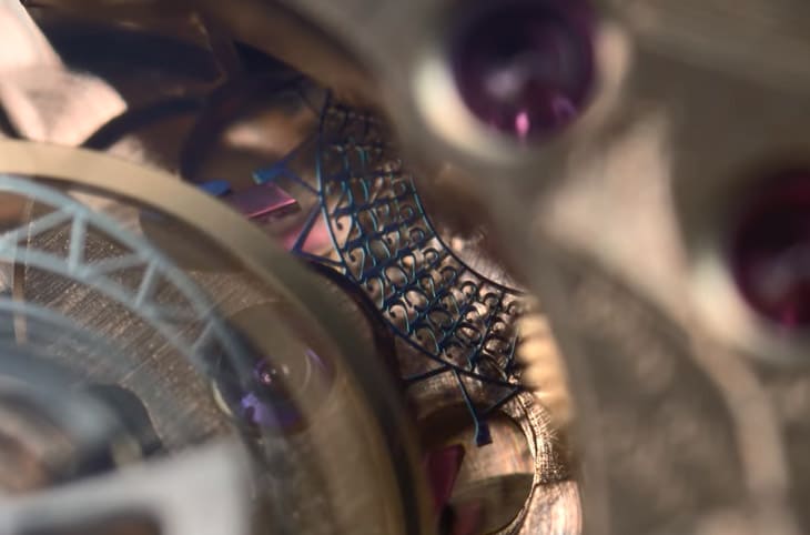 真正让7225成为技术代表作的,是它搭载的74SC手上链机芯,这枚机芯以361枚零件构成,却蕴藏两项革命性创新。第一是磁力转轴摆轮(Magnetic Pivot),利用两端微型磁铁产生的磁场,使摆轮轴悬浮并自动归中,几乎消除零件摩擦机会,确保长期稳定的走时精度。这个机构的动态平衡效果,堪比昔日陀飞轮的补偿功能,却以更轻巧的方式实现。第二项突破是10Hz超高震频,换算下来每小时达72,000次震动,走时误差控制在每日±1秒之内,堪称机械表的极致精准境界。