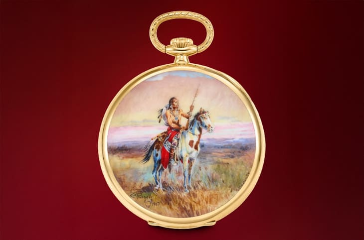 另外,百达翡丽也提供了足以撼动市场的重量级作品,有一款黄金材质、具有"Serpico y Laino"印字的手表被认为是目前已知仅存的一只,由于历史背景特殊,其黑色珐琅面盘搭配夜光时标与指针,完整呈现20世纪中期的经典工艺质感,估价为25万~45万美金(约合台币785万~1410万),反映出市场对稀有古董百达翡丽一向保持的高度信心。另一件值得留意的,是名为The Scout的百达翡丽怀表,由原藏家后代释出、并曾为1995年「百达翡丽传奇名表」展所准备,表壳上的微绘珐琅作品由大师G. Menni手绘,灵感源自C.M. Russell的1907年画作,是典型「艺术性与工艺价值并重」的作品,估价介于10万~20万美金(约合台币310万~630万)之间。