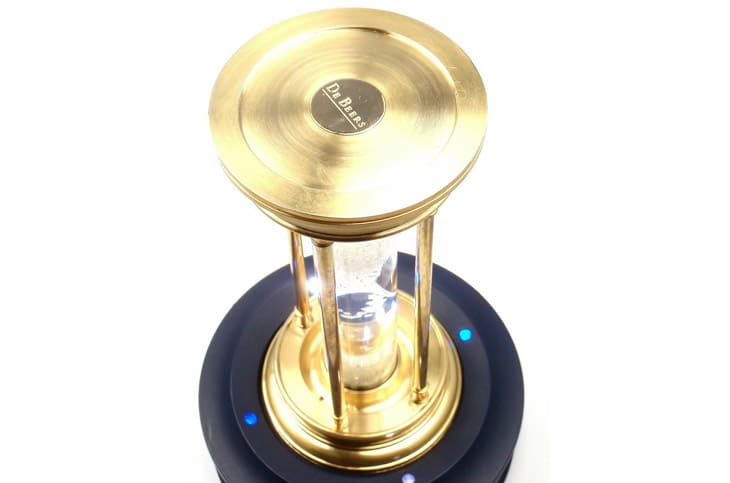 这款沙漏的外型设计同样充满千禧年时代的奢华风格,整座沙漏高度约14.8cm,重量接近760公克,拿在手上相当有份量,镀金黄铜支架搭配透明主体,线条简洁却不失存在感,底座内藏电池供电的照明装置,启动后,光线由下而上穿透沙漏,让钻石在流动过程中逐一被点亮,整个过程就像一场精心编排的光影演出。