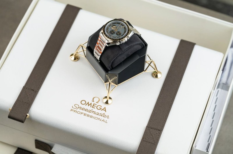 谈到善用包装说故事,欧米茄绝对是代表性案例。超霸系列的登月表,几乎已把表盒变成叙事道具,模拟太空衣布料的外观、附加的表带与扣环,都在强化「太空任务装备」的角色设定,某些版本甚至加入放大镜与钢制纸镇,巧妙呼应太空飞行的情境;阿波罗11号50周年纪念款更直接把登月舱变成表座,这些设计未必人人需要,但对收藏家来说,却大幅加深了情感连结,也让人更愿意完整保存盒单。