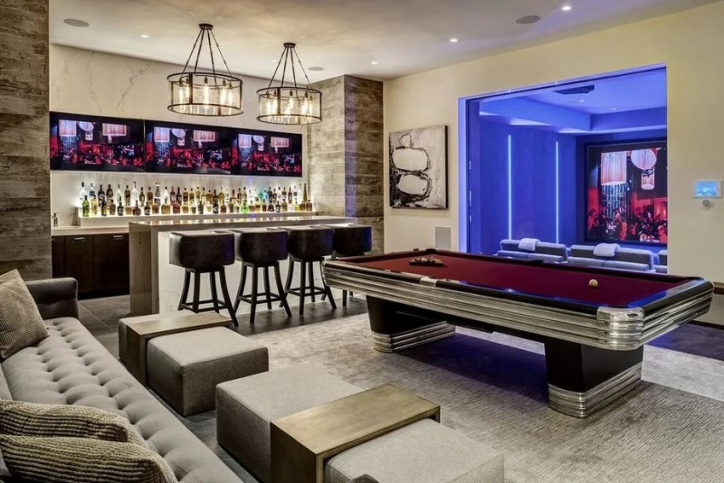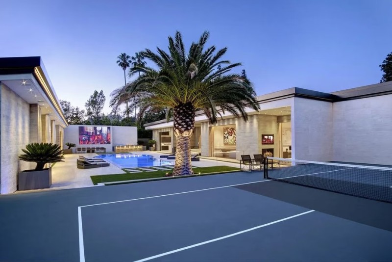 顶级配备包含专业主厨厨房,配备了大理石岛台和用餐区、充足的橱柜空间和最先进的电器。宽敞的用餐区四周环绕着纯白色的墙壁,上方悬掛着一盏优雅的枝形吊灯。还有舒适的家庭剧院、时尚的酒吧与撞球檯、大型健身房、游戏室、户外投影屏幕,后院内设有度假村风格的游泳池,甚至还有可进行匹克球(Pickleball)与篮球的复合式运动场。