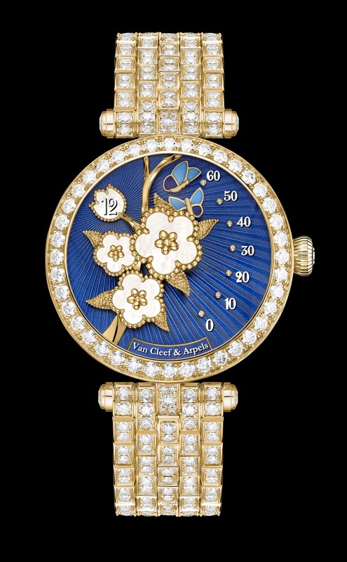 春回大地的意象转化为腕间时计Lady Lucky Spring Butterfly,展现制表与珠宝的双重造诣。搭载自动上链机芯,具备逆跳分钟及跳时功能 。表盘上的彩蝶会随分钟前进曼舞、寻找舞伴,于整点时飞返原点,呈现「蝶舞双双」的诗意意象 。33 毫米表盘採用璣镂(guilloché)饰纹与珐琅工艺 ,镶嵌三枚白色珍珠母贝梅花图腾,呈铃兰造型的视窗以圆珠围拢,透现其下的白色珍珠母贝日期盘,表底盖则鐫刻嫩叶图案并镶嵌蓝宝石玻璃,透现平衡摆陀 。