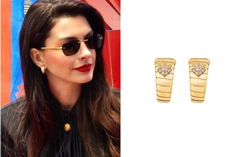 在墨西哥站的宣传活动中,安·海瑟薇则展现了更具都会俐落气息、甚至带点叛逆的穿搭。她换上了宝格丽 Tubogas 系列的黄 K 金镶钻铆钉圈式耳环,耳环的设计加入了钻石铆钉的细节,大幅提升了整体的视觉锐利度与工业感。此外,她也配戴了同为 Tubogas 系列的矩形无框太阳眼镜,透过金属镜脚及烟灰色镜片衬托出她摩登前卫的时尚态度。对于《穿着Prada的恶魔》的铁粉来说,太阳眼镜一直是剧中极具代表性的气场单品;这次以无框且带有强烈金属工艺元素的设计呈现,更加凸显了角色具备敏锐观察力与前卫思维的迷人特质。