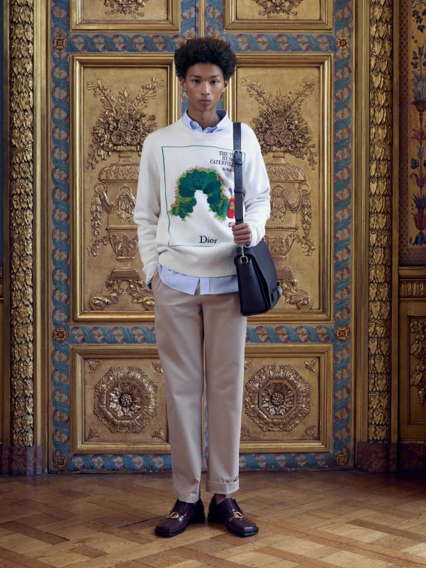 男装系列则大胆结合了中古世纪的徽章语境与当代学院的随性气息,设计团队将美式语汇丰富的丹寧材质运用于传统燕尾服的严谨剪裁中,同时透过质朴的 Donegal 羊毛毛呢重新诠释迪奥先生钟爱的英式风格 。从宽版的 Delft 印花短裤、橄欖球衫到气场强大的长大衣 ,系列完整呈现了当代绅士的多元面貌。再搭配新款的 Dior Gravity 皮革手拿包 、柔软的邮差包与乐福鞋 ,这些单品透过精确的混搭,成功将 18 世纪的精致美学,转化为现代男士衣柜中实穿又不失高级感的日常服饰。