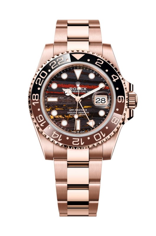 鐵虎眼石是由虎眼石、紅碧玉與赤鐵礦交織而成,帶來極其迷人的色彩流動感,表面呈現金棕色、紅橘光澤與灰黑礦物紋理在光線下閃爍變幻,每一枚面盤都如同天然藝術品,沒有任何兩塊會完全相同。傳統上勞力士運動錶的面盤大多採用黑色或單色系,而這次鐵虎眼石的運用,等於打破了長久以來的慣例,它將大自然的原始力量直接帶上手腕,與玫瑰金錶殼相互呼應,形成一種既奢華又具異國情調的氛圍。面盤上的時標與指針同樣以永恒玫瑰金製作,並填入Chromalight夜光塗層,確保夜間仍清晰易讀,3點鐘方向的日期窗搭配經典小窗凸透鏡,延續了GMT-Master II 的易讀性傳統,這種兼顧實用性與特殊性的設計,正是勞力士設計的獨到之處。
