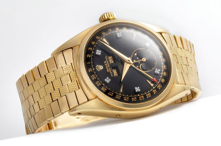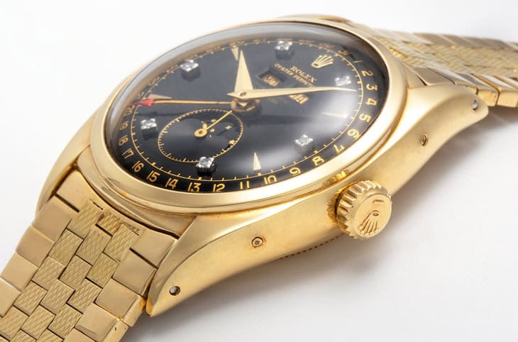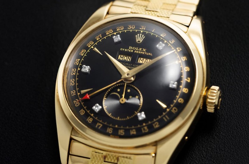 對於熟悉勞力士歷史的收藏家而言,Ref. 6062可說是品牌最具象徵意義的古董錶之一,這款誕生於1950年代初期的手錶,是勞力士首度將「三重日曆加月相」這類複雜功能整合進Oyster防水錶殼的作品,堪稱品牌技術巔峰的代表。根據資料顯示,Ref. 6062僅生產約350只,其中搭配黑色面盤與鑽石時標的版本更是鳳毛麟角,全球目前僅知三只存在。