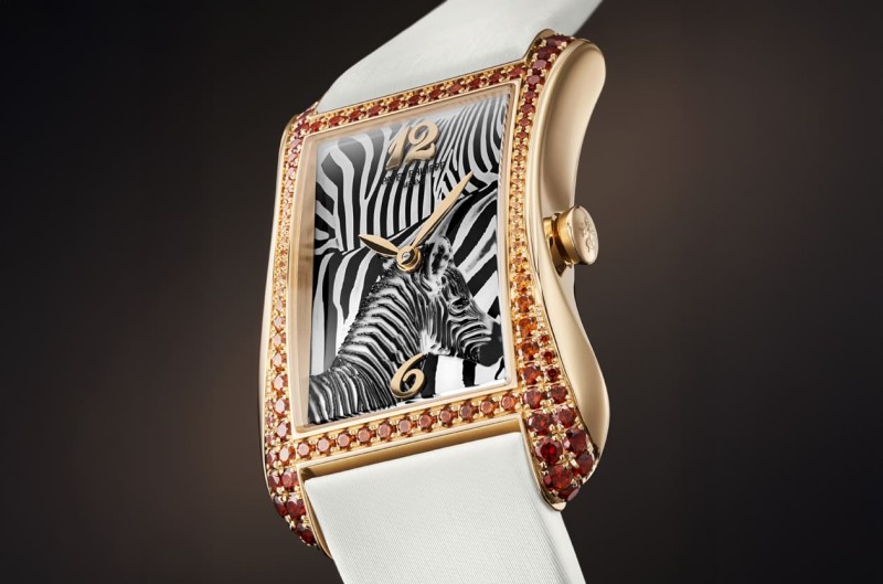 18K玫瑰金材質/石英機芯/時、分顯示/雕刻、清漆裝飾斑馬圖案面盤/錶款鑲錳鋁榴石94顆,約重2.02克拉/藍寶石水晶鏡面/防水30米/錶徑40.85x28.6mm/參考價:NT$ 1,387,000
