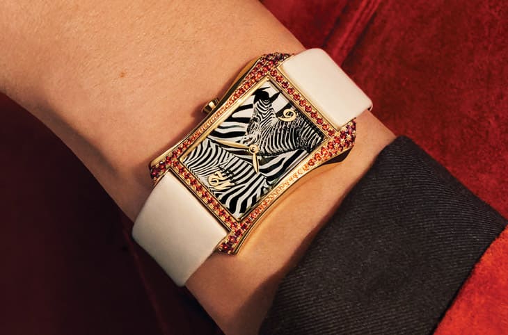 Gondolo Serata系列自2006年誕生以來,一直以流線弧形與裝飾藝術風格著稱,它的矩形錶殼線條修長,帶著一種20世紀初的女性風情,卻又能自然融入當代造型美學。早期白金鑲鑽版本以珍珠母貝面盤深植人心,後來的玫瑰金花卉圖案款則增添更多女性柔光,而2025年的「斑馬」設計,則將這種優雅推向更前衛的層面,讓狂野與秩序共存,成為一場腕上藝術的對話。