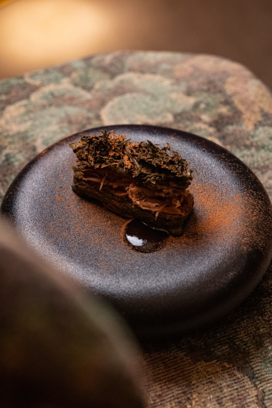 走進SEASON Artisan Pâtissier的劇場,十道作品在主廚洪守誠的手中緩緩展開。這場以甜點為劇本的演出,分為「甜點師詮釋的料理」與「料理人思維下的甜點」上下兩幕,透過法式技藝與東方食材的融合,讓每一道都像一場穿越東西文化、在味蕾間展開的精彩故事。像是開場的〈悠遊布列塔尼/愛知〉讓醋漬鯷魚以詼諧幽默的視角化身主廚的分身,在法國與日本之間穿梭。〈巴黎/佐賀森林〉以閃電泡芙為載體,結合牛蒡、芝麻與蕈菇的土地氣息,營造出法式甜點少見的層次感。