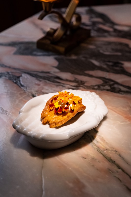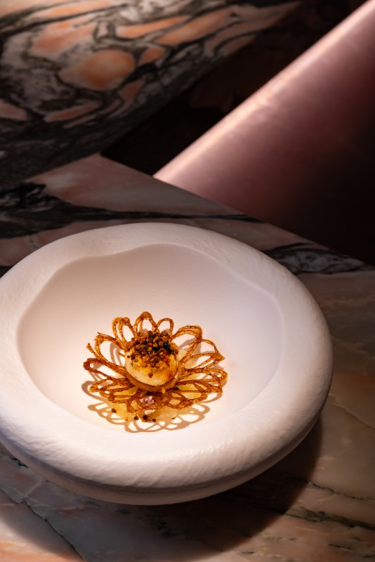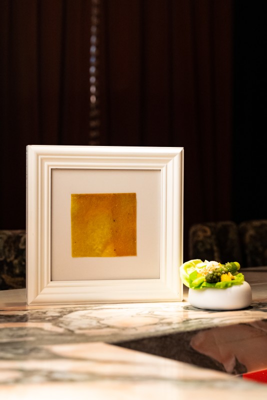 隨著故事推進,法式藝術的風情逐漸融入料理之中,讓每一道甜點都像是一幅可食的畫作。〈水果潤餅〉便是其中之一,此道以梵谷畫作《麥田》中的風景為靈感,以蔬菜與蔬果軟糖製成的一幅具有麥田意象的畫,並融入法國名廚 Michel Bras 代表作多彩時蔬花草溫沙拉的概念創作而成。〈虛幻的向日葵〉則將梵谷的筆觸化為立體的甜點,讓那朵花不再靜止於畫布,而是在味蕾上綻放。在一般印象中,一場餐敘通常以甜美作結,而作為全劇壓軸的〈喬治桑之手〉卻以水果的苦與辛香料的辣交織出意料之外的餘韻。這道同樣以梵谷精神為靈感的甜點以千層派為主體,結合炙燒蛋白霜的細膩結構,搭配日式醃漬薑片與山葵的辛香,形成出人意料卻又耐人尋味的收尾。