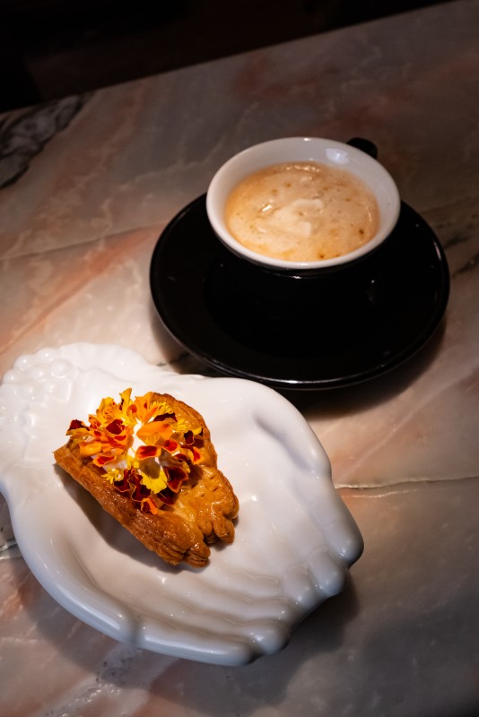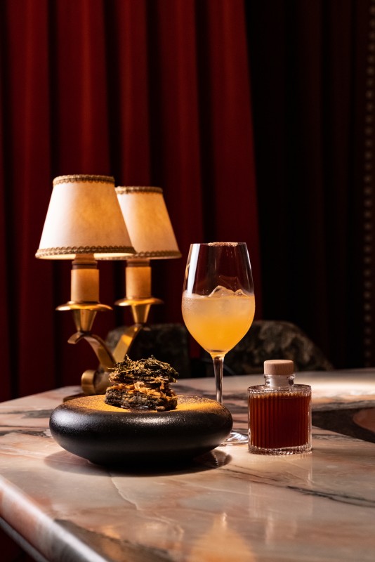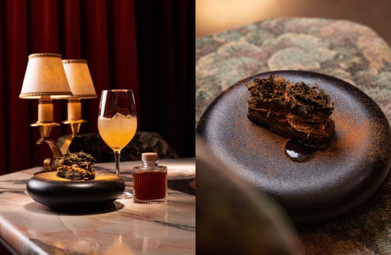 第二季最有趣的是這次的「三線結局」設計,顧客可以從咖啡、茶或調酒中選擇自己的pairing故事線。咖啡線由世界冠軍簡嘉程(Ninety Plus) 打造,從帶氣泡的「香檳清酒」到有紫蘇香氣的 Mojito,每一款都像在講不同的章節。茶線由琥泊茶苑Liquide Ambré 操刀,以包種茶與白茶搭配花果氣息,呼應甜點的餘韻。酒線則由Bar Mood吧沐創辦人吳盈憲設計,從琴酒到威士忌構成三款浮世繪主題調酒,這樣的設計讓甜點不再只是單一的品嚐,而是一場能夠自己選擇結局的沈浸式味覺體驗。
