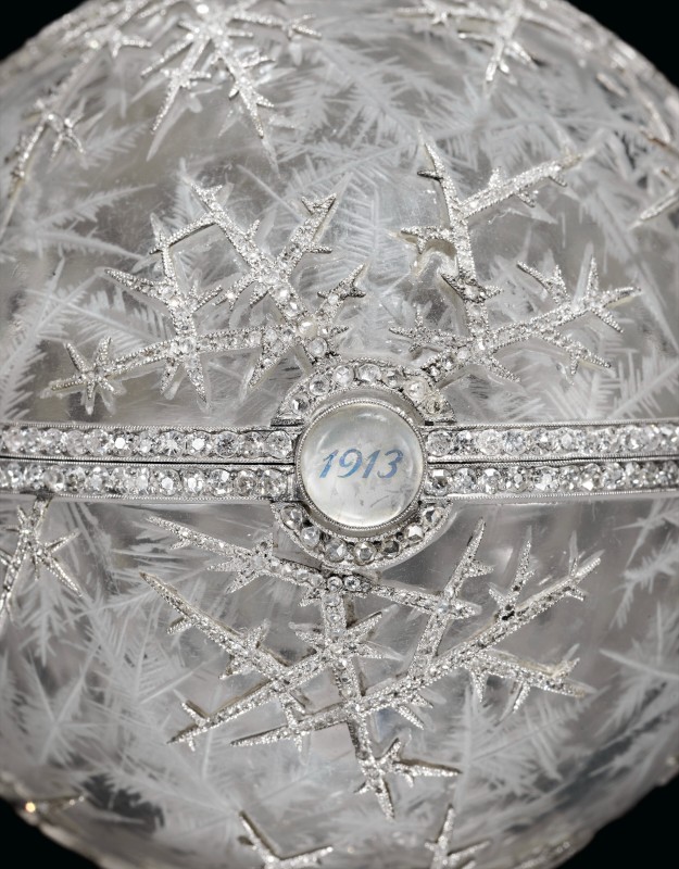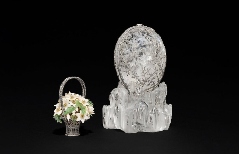 曾屬於俄羅斯皇室的Winter Egg冬日彩蛋,整顆彩蛋由水晶精雕細琢而成,內部表面輕柔地鐫刻著一層霜花,外層則飾以鑲嵌鑽石的鉑金雪花,鑲嵌著超過4000顆玫瑰式切割鑽石,靜靜地立於一塊形似緩緩融化的冰塊的水晶底座之上。打開彩蛋,便會發現其中蘊藏的靜謐之美,一個精緻小巧的鉑金籃子,內盛著綻放的銀蓮花,花瓣由白色石英雕刻而成,花莖則由軟玉製成,花蕊上點綴著鮮豔的綠色石榴石。此花通常是俄羅斯嚴冬後最早開放的花朵之一,也是法貝熱為彩蛋創造的「傳奇驚喜」之一。