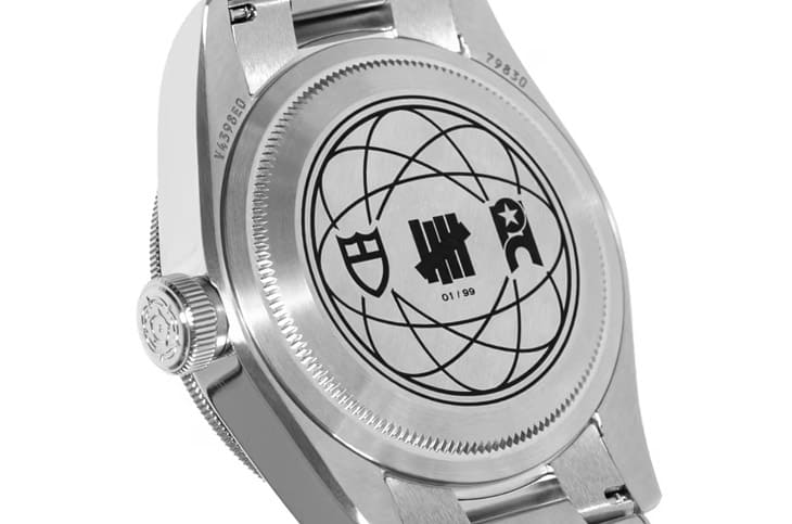 翻到錶背,收藏價值的訊號變得更加直接,雷射鐫刻的圖案以類原子結構的形式呈現,三方品牌Logo被整合在中心位置,每一只手錶都擁有專屬編號,清楚標示其在99只中的獨立身分,這是一種對「少數人擁有」這件事的默契確認,也讓這只錶從工具,升級為紀念物。