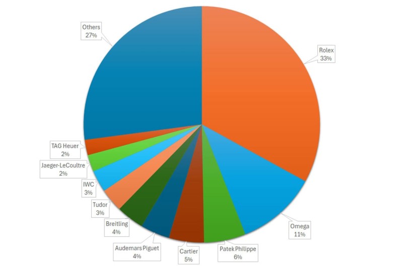 ▲2025年上半年高級手錶品牌的二級市場份額,其中勞力士便佔了3成以上。Source:Chrono24 x Fratello H2 2025 secondary market watch report
