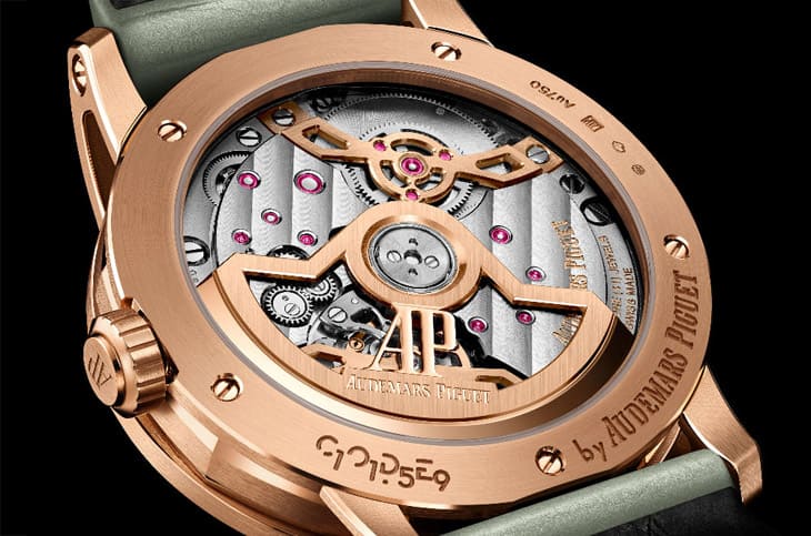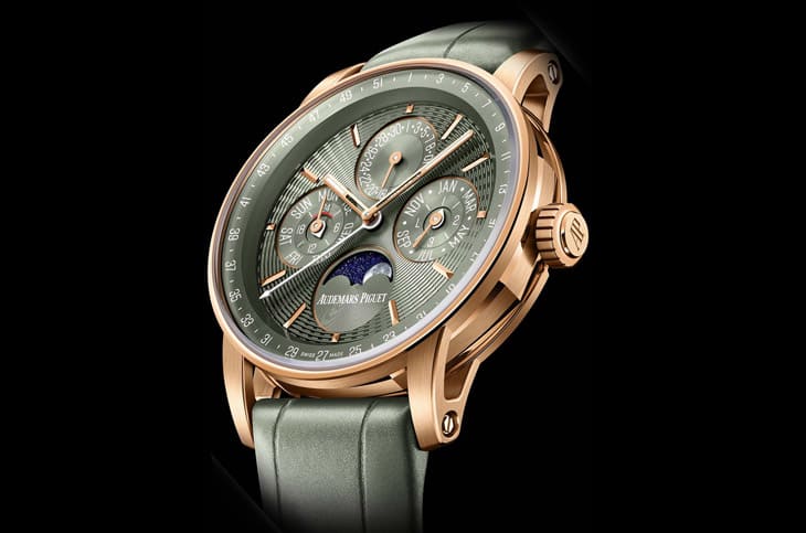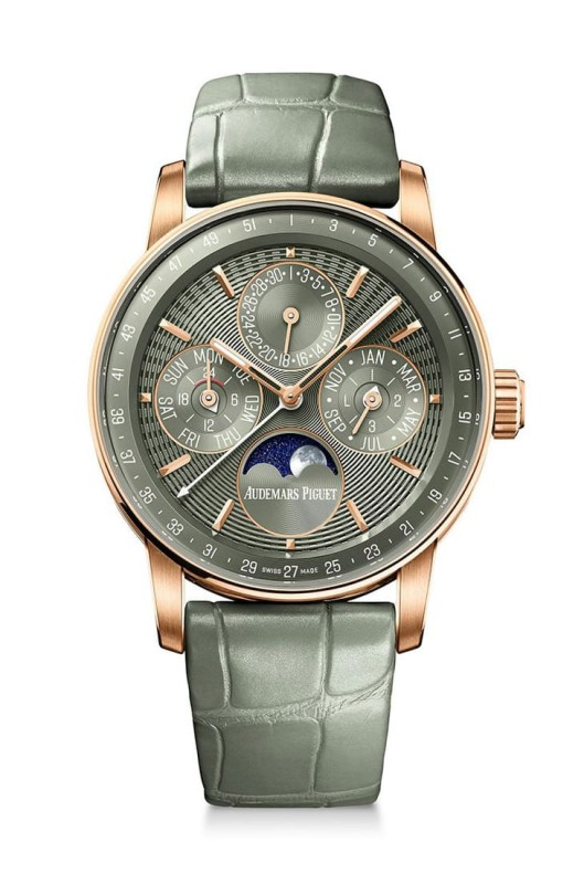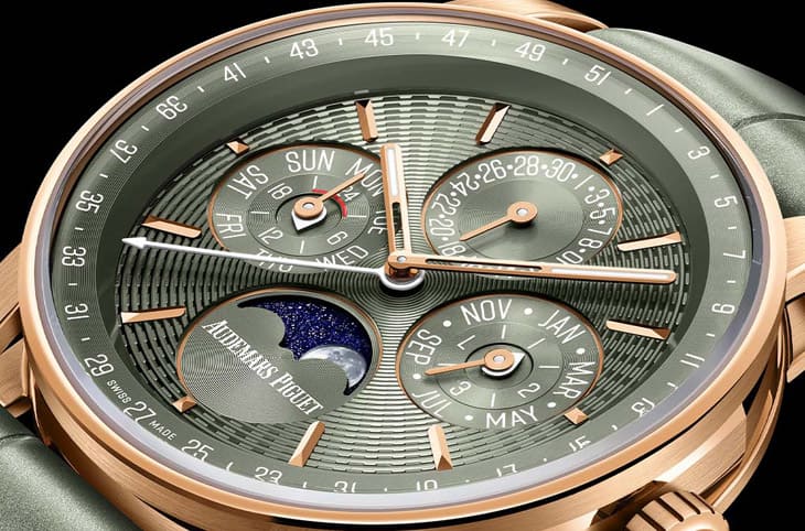 這只手錶選用柔和而富層次的綠色面盤,與玫瑰金錶殼形成鮮明卻不張揚的對比,這種配色保留高級複雜手錶的優雅,也多了一份年輕而現代的氣息。面盤表面裝飾著CODE 11.59系列招牌的浮雕圖案,這項由愛彼與雕刻工藝大師Yann Von Kaenel合作設計的紋理,由同心圓與細密凹孔組成,隨光線變化呈現出細膩的立體感。手錶的日期顯示設於12 點鐘方向,星期與月份分別位於9點與3點鐘方向,形成穩定的對稱結構,內錶圈上的週曆刻度同樣經過調整,第一週直接位於正上方,視覺邏輯一目了然。6點鐘方向的月相顯示,以NASA月球影像為基礎繪製,寫實而不流於浮誇,滿月置中於垂直軸線,讓整體構圖上下取得平衡。
