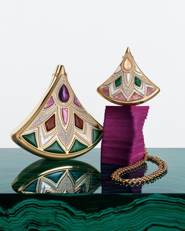 同時,作品中也廣泛運用了紫水晶、虎眼石、珍珠母貝與孔雀石等彩色寶石,為作品注入珠寶質感,包口處更鑲嵌了寶格麗標誌性的蛋型切割寶石,為實用功能增添奢華亮點 。此外,此系列特別延續寶格麗典藏包款的比例,同時推出「晚宴包」與「迷你晚宴包」兩種尺寸供選擇,並搭配精緻鍊帶,讓精緻華麗的晚宴包也能隨心斜挎、優雅出行 。
