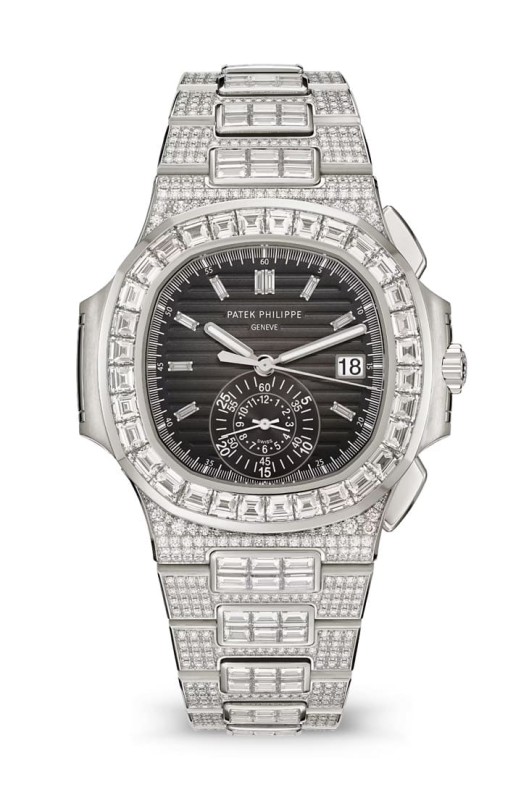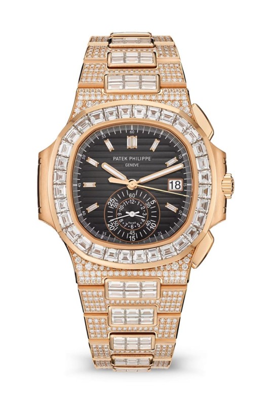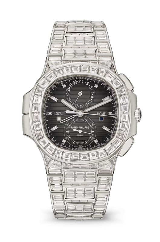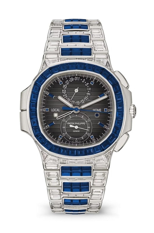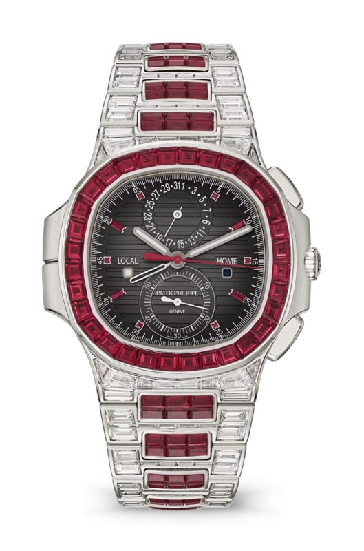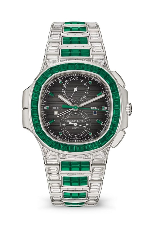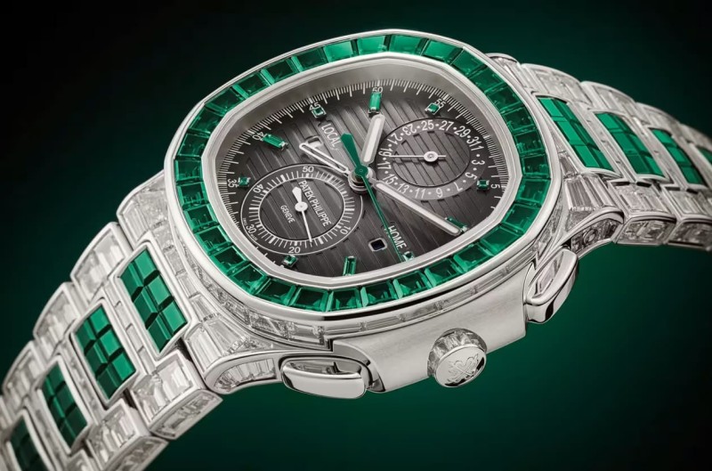 真正把奢華推到極限的,還是Nautilus Ref. 5990,它具備兩地時間、日期加計時功能,再搭配整只錶400多顆長方形切割鑽石,寶石總重超過33克拉,這已經不是手錶,而是會走時的珠寶藝術品,但是價格自然毫不客氣,全鑽款約 5,300台幣,彩色寶石版本突破6,000萬台幣,祖母綠款甚至超過8,300萬台幣。