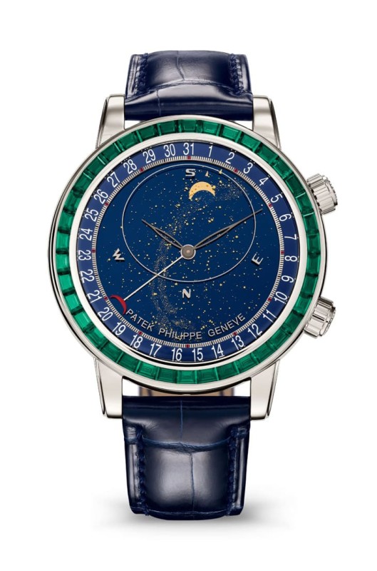 鉑金材質/240 LU CL C自動上鍊機芯/時、分、日期顯示/星空圖/月相、月亮軌跡顯示/錶款鑲祖母綠60顆,約重3.92克拉/藍寶石水晶鏡面、透明底蓋/防水30米/錶徑44mm/參考價:NT$ 26,716,000