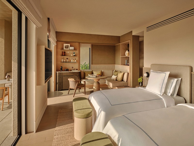於去年3月落成的「宮古島瑰麗酒店(Rosewood Miyakojima)」隱身於人跡罕至的大浦灣,以全Villa房型與專屬管家服務重新定義了日本海島的奢華基準。負責空間規劃的荷蘭大師級建築團隊Studio Piet Boon刻意褪去繁複的裝飾,選擇向宮古島純粹的風土致敬。55間臨海別墅以溫潤的木造建材與透氣的棉麻織物為主調,構築出與窗外礁石、沙灘相呼應的礦物色系。空間裡沒有喧賓奪主的搶眼設計,取而代之的是在地職人手捏的陶器與低調的青銅茶具。這種化繁為簡的流暢動線與細節鋪陳,完美詮釋了一種不張揚卻極具質感的避世美學。