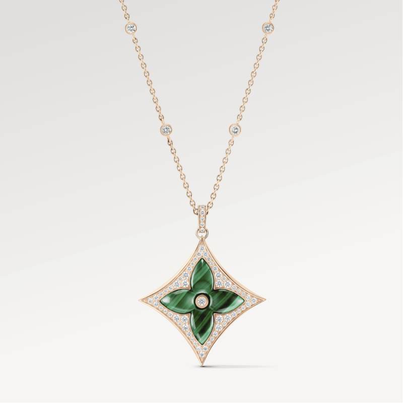 除了全新硬石的加入,璀璨的密鑲設計(Pavé)也全面引入本次新作中。珍貴的密鑲細節奢華地環繞著中心弧面寶石,勾勒出標誌性的圖案,不僅增加了整體的光澤和閃耀度,也增強了光影對比,突顯中心寶石的深度與強度。這項精湛工藝要求路易威登珠寶工匠精確執行,以精細拋光黃金達到高光澤的完美角度。全新的密鑲作品包含了搭配單鑽的白色珍珠母貝星星與太陽精緻吊墜,以及兩款引人注目的圓形獎章式項鍊:一款為孔雀石星星圖案,另一款則是白色珍珠母貝太陽設計。