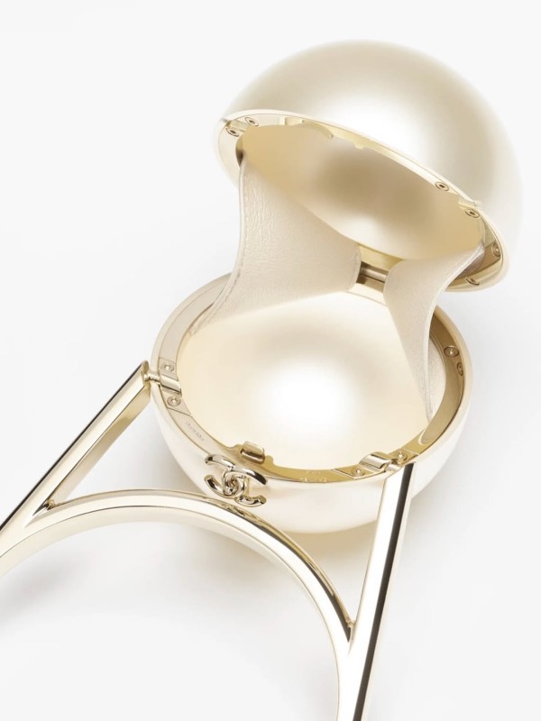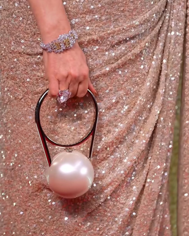在包包的選擇上,Nita 展現了其卓越的時尚品味,捨棄了繁複的設計,選擇了一款香奈兒2025/26 秋冬高級時裝系列的珍珠造型手拿包Pearl ring minaudiere,同樣呼應了傳承的概念。手袋本身以巨大的圓潤珍珠搭配高級皮革,珍珠的溫潤光澤平衡了金色亮片的強烈視覺,珍珠在東方文化中象徵圓滿與純潔,常作為傳家首飾,展現出「靜奢風」(Quiet Luxury)與「宏大美學」(Maximalism)之間的巧妙平衡。而香奈兒的設計代表了優雅時尚百年不衰的韌性,碰到東方的傳統紗麗,正是東西美學交匯,展現出一種「超越流行」的厚度,定義禁得起時間考驗的優雅。