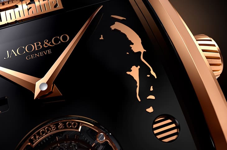 18K玫瑰金材質/JCAM62手動上鍊機芯/時、分顯示/陀飛輪裝置/音樂盒功能/雙動力儲存顯示/黑色漆面面盤/藍寶石水晶鏡面、透明底蓋/防水30米/錶徑44x42mm/限量74只/參考價:USD$ 440,000