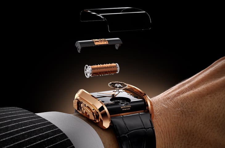 外觀設計上,這款作品也明顯走出品牌過去Opera系列那種誇張的大尺寸圓形錶殼,改採更講究比例與線條的長方形輪廓,靈感來自1930年代的Art Deco風格。18K玫瑰金打造的錶殼在44x42mm的尺寸下,呈現出更貼合手腕的弧形結構,不僅視覺上更精緻,實際佩戴也更友善:更有意思的是,這個造型並非純粹美學考量,它同時像一個微型共鳴箱,對於音樂功能的聲音傳導也有實質幫助。