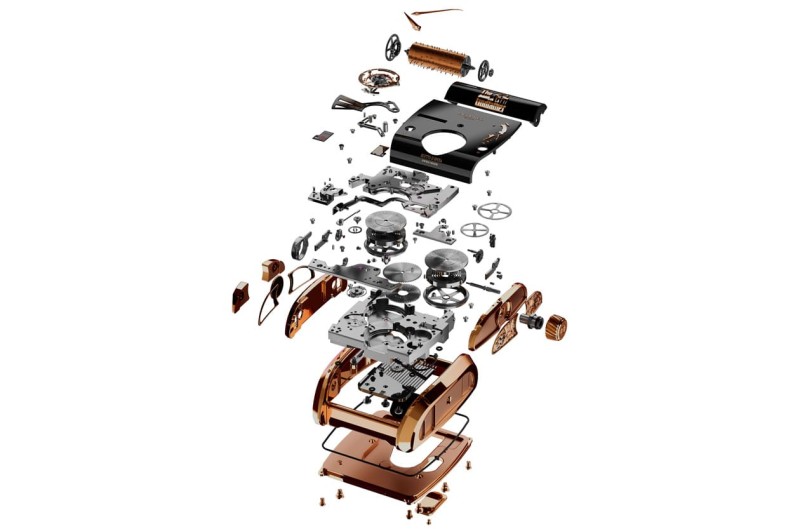 ▲JCAM62機芯由510枚零件組成,整合飛行陀飛輪、雙發條動力及音樂盒機構,兼具精密與多功能性。
