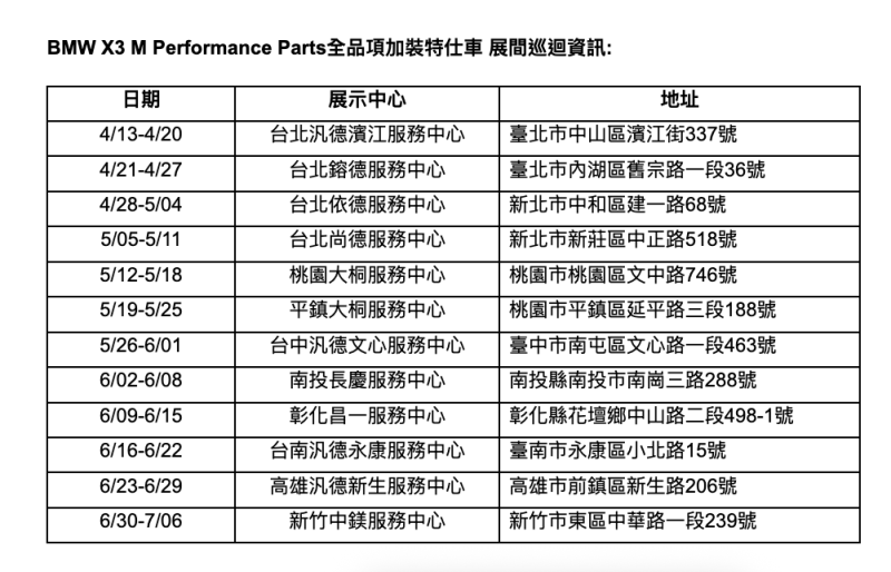 全新BMW X3以前瞻設計語彙、智慧數位科技與精湛動力表現持續進化,不斷突破既有框架,持續引領同級車款邁向全新高度,總代理汎德特別推出「BMW X3 M Performance Parts原廠加裝品特仕套裝」,提供「探索版」、「曜動版」與「競技版」三大專屬升級方案,並同步提供22吋M Performance鍛造鋁圈套件,讓車主依循自身風格,自由勾勒專屬的性能美學。BMW X3 M Performance Parts全品項加裝特仕車將自2026年4月13日~7月6日於全台BMW授權展示中心巡迴展出,期間提供三大特仕套裝專屬優惠,單品加裝亦享95折禮遇,更可近距離感受BMW X3全面進化的動感魅力,更多升級內容與安裝資訊,敬請洽詢全台BMW授權展示中心。