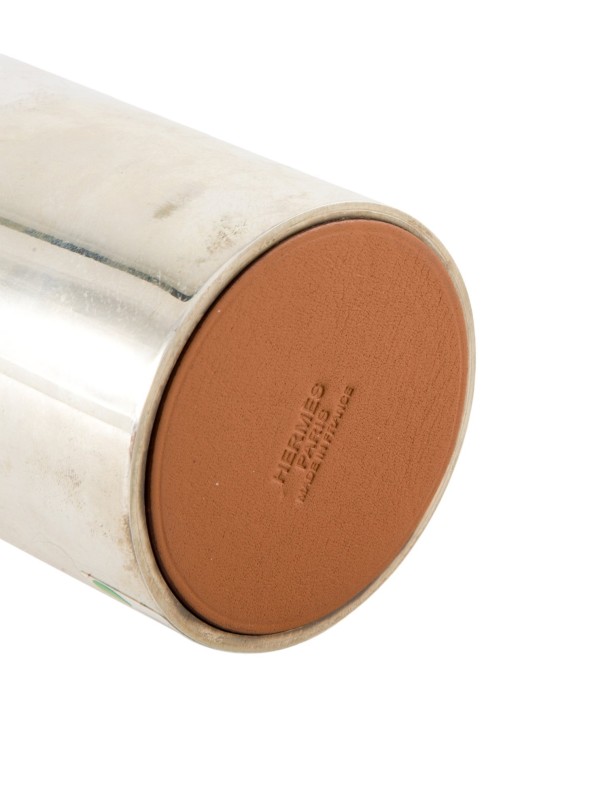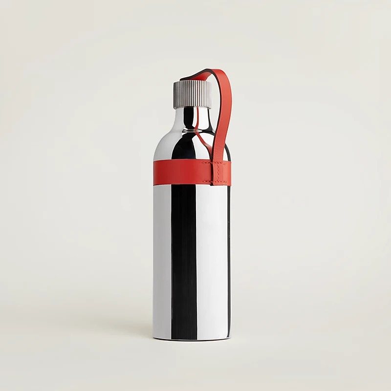 這款水壺的靈魂,藏在細節中。它隨附一條長度可調節的皮革背帶(Drop length 介於 43 至 51 公分之間),採用愛馬仕標誌性的皮革材質。這條背帶不僅增加了攜帶的便利性,更讓冷冽的金屬與溫潤的皮革產生對比。瓶底處壓印有精緻的愛馬仕標誌,與皮革底盤完美貼合,確保水壺在放置時穩固且不發出刺耳聲響。