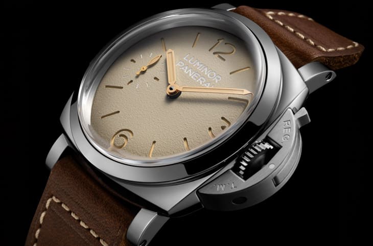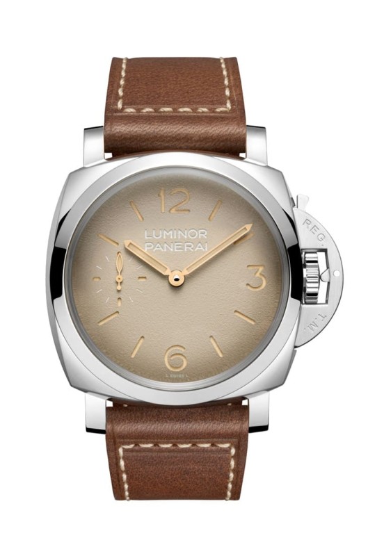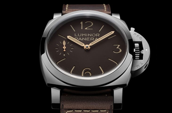 沛納海對1960年代經典設計的致敬,在PAM01731與PAM01732上展現得相當完整,兩款手錶同樣採用44mm不鏽鋼錶殼,將原本47mm的大尺寸重新調整,更符合現代佩戴需求。PAM01731以菸草色面盤搭配粒紋質地,呈現一種內斂而成熟的復古氣質,小秒盤設於9點鐘位置,整體配置相當經典。