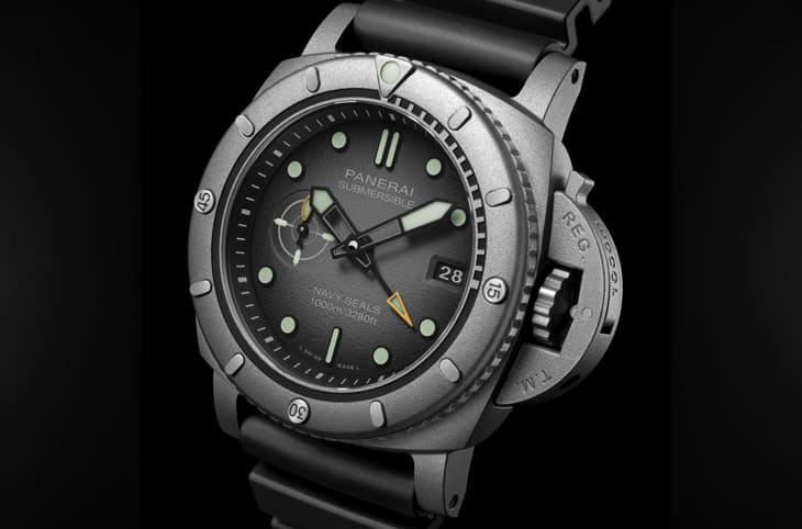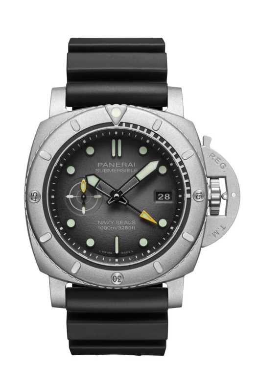 壓軸登場的,是Submersible Navy SEALs PAM01089,一款將工具錶精神推到極致的作品,這不只是一只手錶,更是一種體驗,錶主將受邀參加美國海軍海豹部隊的沉浸式訓練,真正進入極端環境中測試手錶性能。這款錶最驚人的,是採用了Afniotech™鉿金屬,這種材料過去多見於核能與航太領域,密度比不鏽鋼高70%,抗腐蝕能力極強,47mm錶殼搭配強化結構,使防水深度達到1000米。炭灰色漸層面盤搭配黃色細節與高亮度夜光塗層,在低光環境中依然清晰可讀,內部搭載P.9010/GMT自動機芯,提供三日動力與兩地時間功能,整體而言,這是一款將「軍事用途」與「收藏價值」結合到極致的作品。