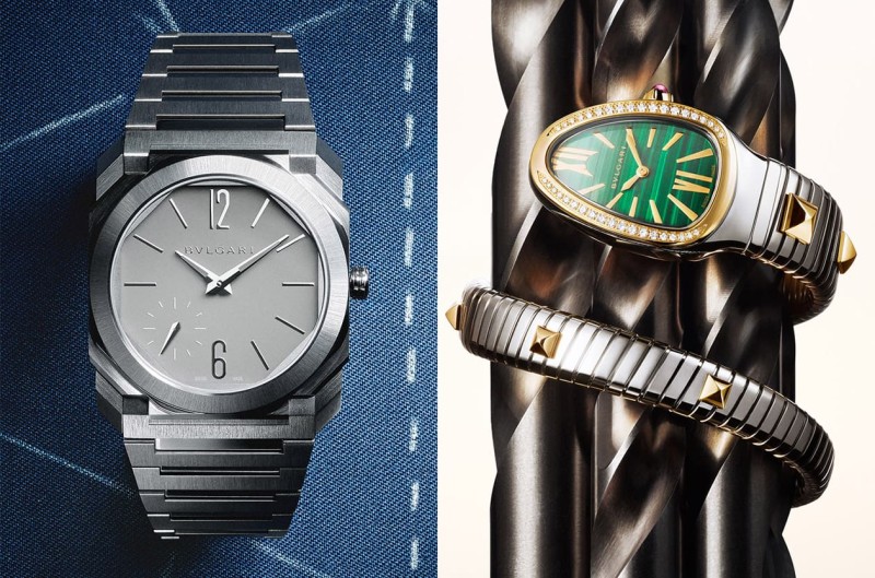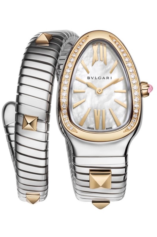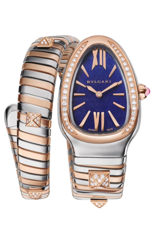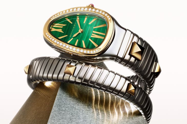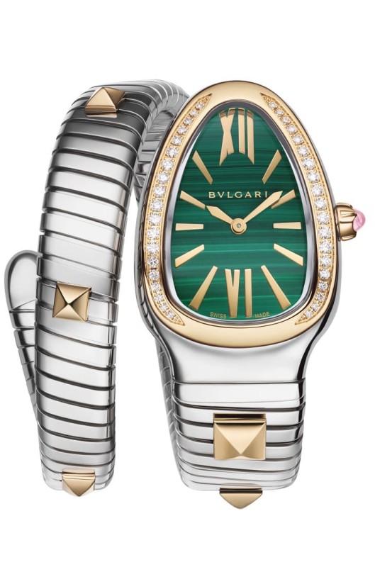 另一邊,寶格麗把焦點轉回最經典的符號——Serpenti。這次的Serpenti Tubogas Studs很有意思,它不是單純做新配色,而是直接改寫設計,把Tubogas的柔軟結構,跟Studs鉚釘元素結合在一起,讓原本流動感很強的蛇形,多了一點建築感與節奏感,那些金字塔切面的鉚釘,在光線下會產生非常強烈的立體效果,整體風格也因此變得更前衛,說白一點,就是「比較有個性」,同時,這個系列其實也在向1970年代寶格麗開創的「Gold & Steel」致敬,把黃金跟不鏽鋼混搭,現在看很正常,但當年其實是非常大膽的做法。今年登場的四款作品,從紅玉髓、藍色方鈉石到孔雀石,每一種石材都帶有很強的個性,再搭配鑽石與Tubogas結構,讓這些錶不只是配件,而更像可佩戴的雕塑。