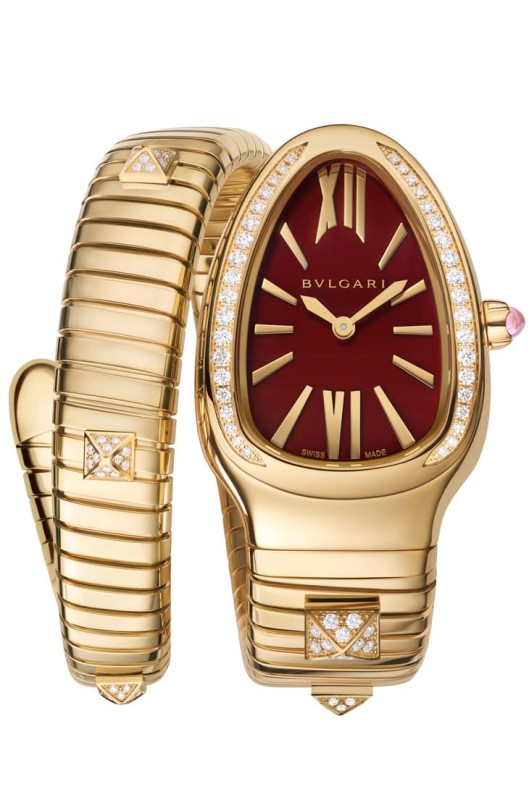 18K黃金材質/石英機芯/時、分顯示/紅玉髓面盤/錶圈鑲鑽38顆,約重0.3克拉/黃金Tubogas單圈錶帶飾以5顆黃金鉚釘、鑲鑽60顆,約重0.6克拉/藍寶石水晶鏡面/防水30米/錶徑35mm