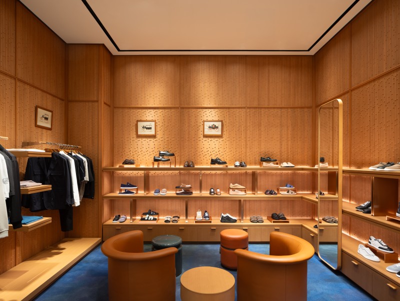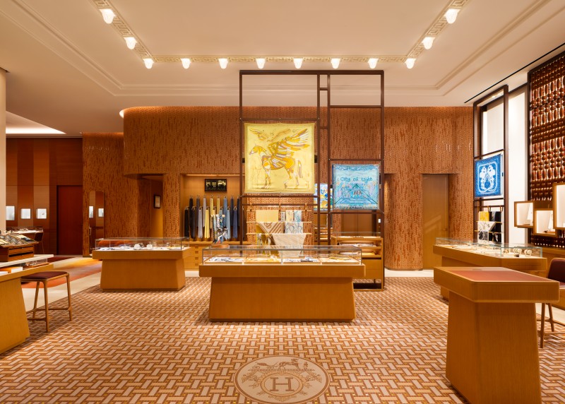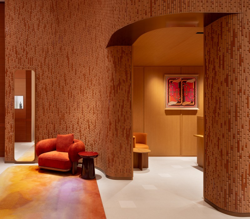 二樓空間延續了整體的溫潤質感,轉以明亮的色調為主軸,完整陳列愛馬仕經典的皮件與居家系列。該層為貴賓規劃了專屬的「獨立休憩區」,而區域內鋪設量身訂製的地毯,透過鮮明的對比色彩,具體轉譯台北夜晚霓虹燈光的流動感,將台灣特有的都會街景帶入室內。三樓空間則在充沛自然光的照射下,營造出明亮且自在的氛圍。地面的圖案鋪陳同樣汲取自城市街道紋理,引領賓客在此寬敞的環境中,接續探索男仕系列、女仕鞋履與成衣區域。
