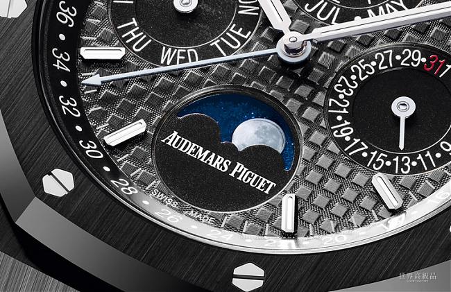 2017年AUDEMARS PIGUET爱彼在錶展上发表的这款黑陶瓷版皇家橡树万年历同样也是令人惊艳的一款。陶瓷材质在AP并不罕见,不过这种科技素材过去多半用在离岸型或是概念款这些比较前卫的產品中,直接用在皇家橡树上的就有点稀奇了;另一方面陶瓷外装如今在錶界原本应该已经见怪不怪了,然而AP的这款却仍然能带给我们相当新鲜的印象,让人会想要细细研究。