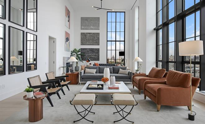 本篇介绍的叁层公寓位于大楼顶层,室内面积為4,932平方呎,包含4间卧房、4间浴室和2间盥洗室,其中客厅与所有房间均享有一流视野,世界彷彿尽在脚下。 公寓主层拥有连通两部键控电梯的私人入口,以及双层挑高的客厅,当中装设的落地大窗可将周围都市景观尽收眼底;同时,主层还设有餐厅和专业厨房。透过客厅的旋转楼梯,可以连通至公寓上层,设有800平方呎的屋顶露台,配备设施包含户外厨房、烧烤区和壁炉。至于公寓的下层空间,则是4间附带浴室的卧室套房所在。
