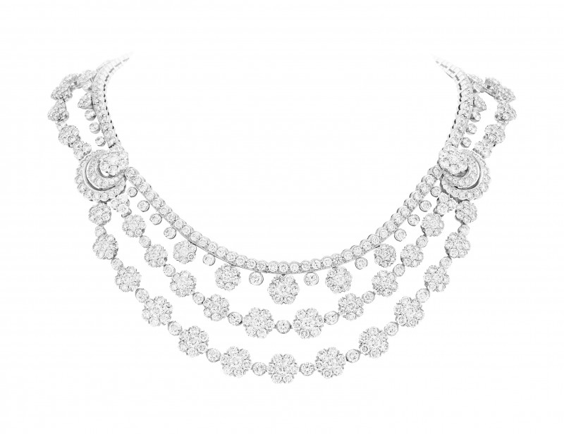秉承可转换式珠宝的传统,为这串炫彩项链构思多达九种佩戴方式,配合不同的心情。项链扣环设计隐密,使不同组件可幻化成三串手链和六款项链,包括单排镶钻短项链,以至两或三排的优雅项链,可塑性极高。项链两旁的双半月图案连系多串精致无比的美钻,全铰接的金工结构,让项链温柔縈绕粉颈或手腕,宛若冬日初雪轻吻肌肤。