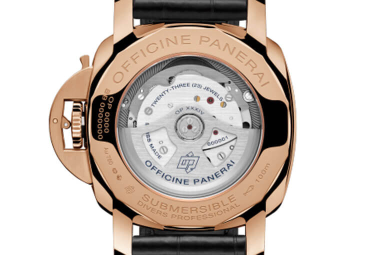 表款的面盘与多数Submersible手表一样都是小三针搭配日期的格局,为了呼应表壳,所以可以发现在时、分、小秒针以及面盘12点方向的”SUBMERSIBLE”字样都改成了金色,而它也是系列中少数启用透明底盖的作品,这也因此使得表款的防水性能不像其他家族成员都有300米的水准,而是稍微降格来到100米,因此我们很难以纯粹运动表的角度来看待它,它反而比较像是有着运动表外型的正装表,考量到真正会带着贵金属去运动的人应该是极少数,所以它的规格以正装表来比较就显得合理许多,也因此它的定价比起多数的Submersible手表都要高出一截。