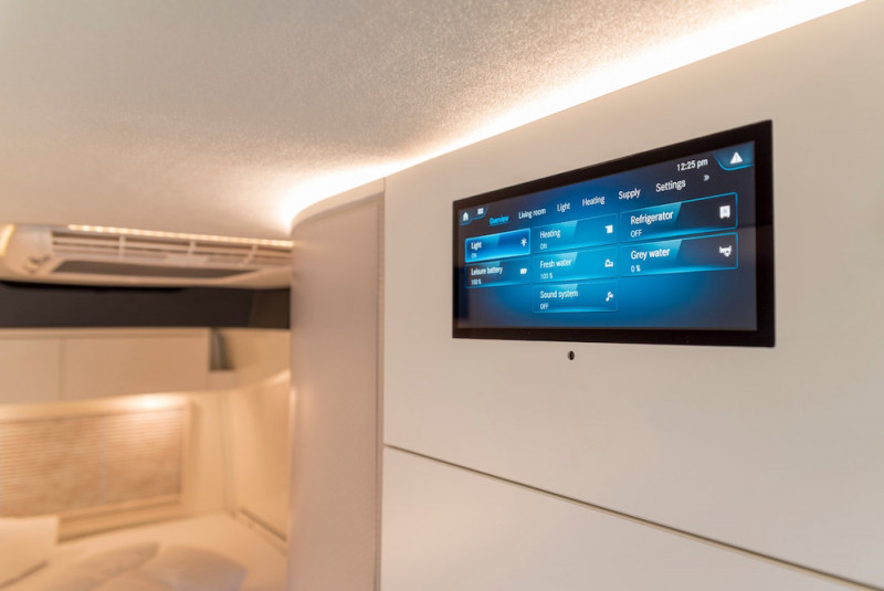 2020年式Mercedes-Benz V-Class Marco Polo露营车,属于豪华的四人厢式货车,在驾驶座的部分可以看见跟熟悉的宾士车一样,中控台上的10.25吋触控液晶萤幕,整合MBUX多媒体服务,用Mercedes me服务可以透过网路进行远端诊断、控制轮胎压力与加油量、保养服务管理、车辆系统监管、导航与及时交通资讯等功能。2020年标配了Mercedes-Benz Advanced Control先进控制套件(MBAC介面),加上原厂提供了一支智慧型手机专用app,能让手机和MBAC介面连线,只要用手机就能操控多种功能。