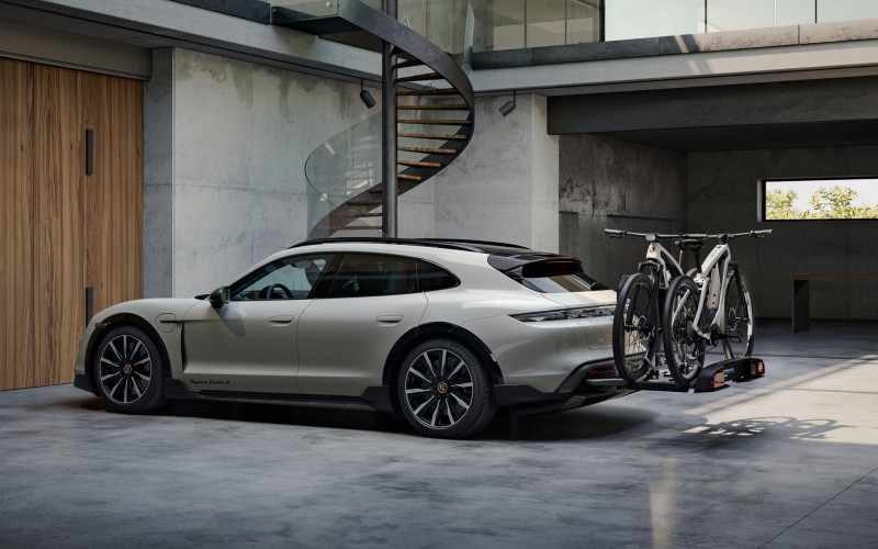 这款脚踏车架装在Taycan Cross Turismo车尾处,同样有车牌跟方向灯,载心爱的脚踏车出门不会影响行车安全。车架本身最大承重50公斤,空间足够装载2台脚踏车,还有安全拉扣帮助固定单车。
