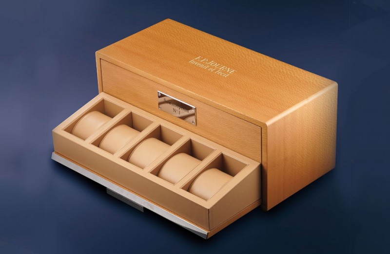光看结果的确有点疯狂,但是表盒背后的故事值得再进一步深入了解。François-Paul Journe先生当初在1999年创立同名品牌,他最先制作的作品是一款限量20只的Tourbillon Souverain à Remontoir d'Egalité “Souscription”。他后来提供20位入手这款表的表主一个早鸟福利,让他们得以优先享有购买F.P. Journe后续作品的权利,结果20位表主中只有一位接连订了品牌后续四只手表——这五款表等于是F.P. Journe的开山奠基之作,而这位超级死忠的表主也理所当然买到的都是编号1号的”Subscription”系列手表,据知这也是市场上唯一一位拥有Subscription系列大全套的表主,所以这表示用来收藏这五只表的表盒也是独一无二的存在。
