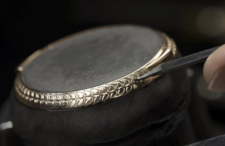 既然是以葡萄酒之神Bacchus为题,因此品牌也单刀直入地在手表外观加上相关的雕刻图案,并严选红宝石镶嵌在表壳上象徵葡萄果实。整只手表外部的装饰工艺分别仰赖手工雕刻师与珠宝镶嵌师分工完成。在进行表壳外部装饰的过程中,雕刻师会先在表壳刻出葡萄藤的轮廓线条,其以浅浮雕技法捕捉葡萄藤叶,并在表壳上凿出113个凹槽,目的是要用来镶嵌5种尺寸不同的红宝石,等到葡萄藤图案和凹槽刻完后,珠宝镶嵌师便会一一将红宝石镶入表壳,有些宝石用爪镶、也有些使用包镶技法,视表壳雕刻线条而适时作出调整。红宝石镶嵌完后雕刻师要继续帮表壳拋光打磨,同时要顾及不能触及红宝石以免影响宝石的完整度与光泽,最终雕刻师还要用敲花技法,强化浮雕图案的立体感。至于表圈、表耳和底盖上也都已手工雕出工整的葡萄藤叶图案,总计手表的外部装饰共要花上300个工时才能完成。
