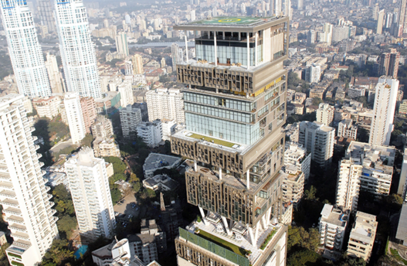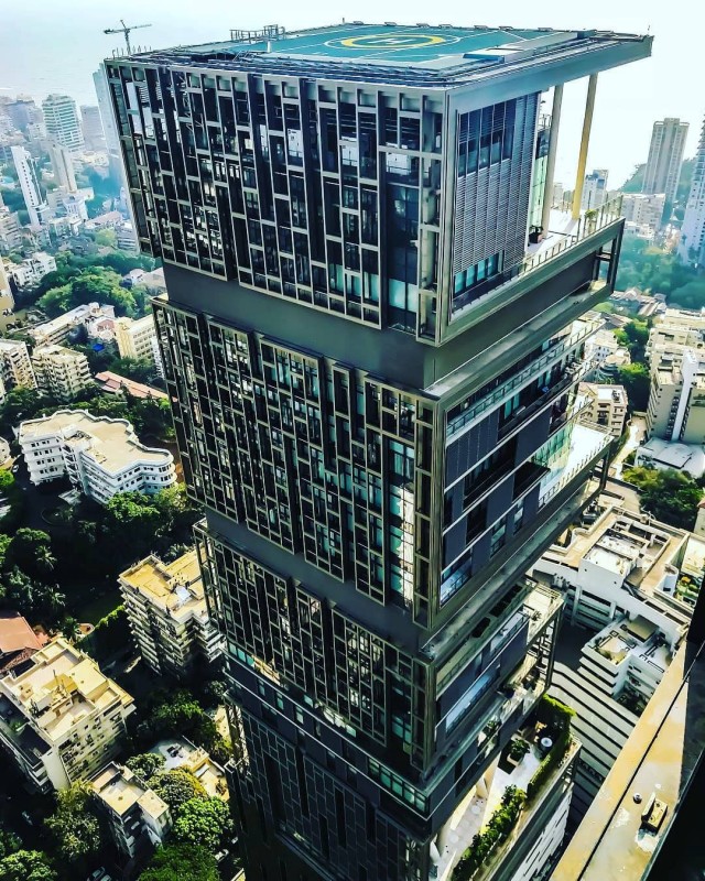 印度首富穆克什·安巴尼(Mukesh Ambani)2021年以1006亿美元、约台币2.82兆元的身价,成为全世界第11位加入千亿俱乐部的富豪。他在印度孟买市中心兴建了Antilia tower,佔地 400,000 平方英尺、约11240坪,高度173米约60层楼,因为楼层挑高设计仅分成27层。由美国公司 Perkins & Will 和 Hirsch Bedner 设计,历时两年建成,于 2010 年完工,耗资估计7000万美元。2022年时价值已经高达20亿美元,展现了奢华和富裕的高度。