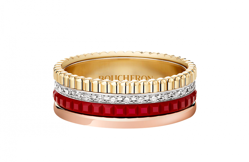2004年,Quatre系列闪耀登场,为Boucheron宝诗龙的斑斕世界注入几何美感和现代气息,成为恆久雋永、男女皆宜的世家标志性系列,风格独树一帜,尽显当代风情,幻化无穷创意。Quatre系列沿袭Boucheron宝诗龙的标志性设计元素,以罗缎直线刻纹 (Grosgrain)、钻石圈、双圈同心圆 (Double Godron) 和巴黎饰纹 (Clou de Paris) 四大经典饰纹,铸就旷世之作,可单独佩戴,亦可叠戴混搭;可颯爽俐落,亦可繁复艳丽;可传统雋永,亦可创新惊艳。组合方式千变万化,随心而动,随情而行。Quatre系列以大胆不羈的美学设计诠释Boucheron宝诗龙世家的自由精神,将作为进驻芳登广场首家珠宝商的曼妙灵感与黄金雕刻工匠的卓越造诣相结合。从戒指到手鐲,从耳环到项链,Quatre系列彰显现代风范,演绎璀璨黄金与经典饰纹的万千风华,开启无尽可能。无论心情,无论性格,无论念之所及,每位女性的独特气质和真我风采皆得以淋漓展现。