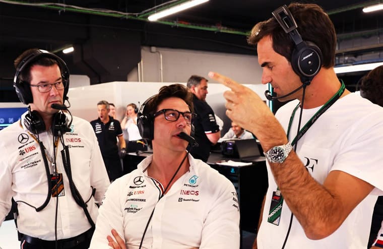 ▲费德勒(右)日前受宾士车队邀请到场参观F1的西班牙排位赛,手上佩戴着劳力士今年爆款GMT-Master II 126720VTNR。Source:perpetual passion