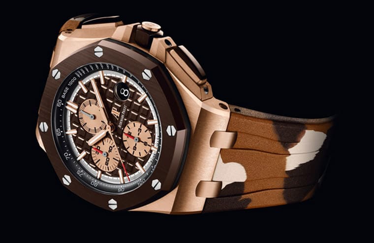从照片上看来,LeBron James当天戴的应该是目前已经停产的皇家橡树离岸型自动计时码表26401RO,这款表同样是玫瑰金材质,搭配棕色陶瓷表圈与同色的Méga Tapisserie格纹面盘,特别之处在于手表搭配了沙漠迷彩般图案的橡胶表带。迷彩这个主题是前几年爱彼创作ROO手表时的重要元素,当时品牌接连推出了几款採用彩色陶瓷表圈搭配迷彩图案胶带的ROO计时码表,一上市就受到许多收藏家青睞,包括LeBron James也对这种突显年轻活力的设计很感兴趣,趁着到摩纳哥欣赏F1赛事的时候秀出这只爱表,也让这张体坛两大巨星的世纪合照多了些让表迷茶餘饭后讨论的焦点。